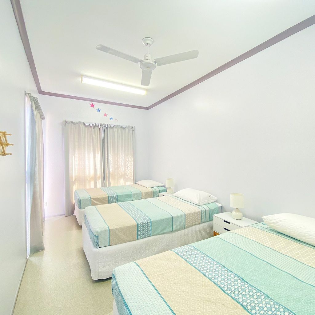 Retreat to two cozy bedrooms, comprising one queen bed and three single beds, providing ample sleeping space for your entire group. Each bedroom features security screens for added peace of mind.