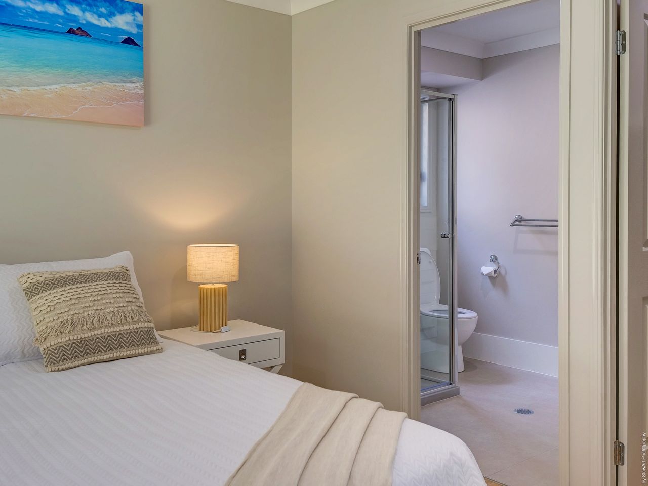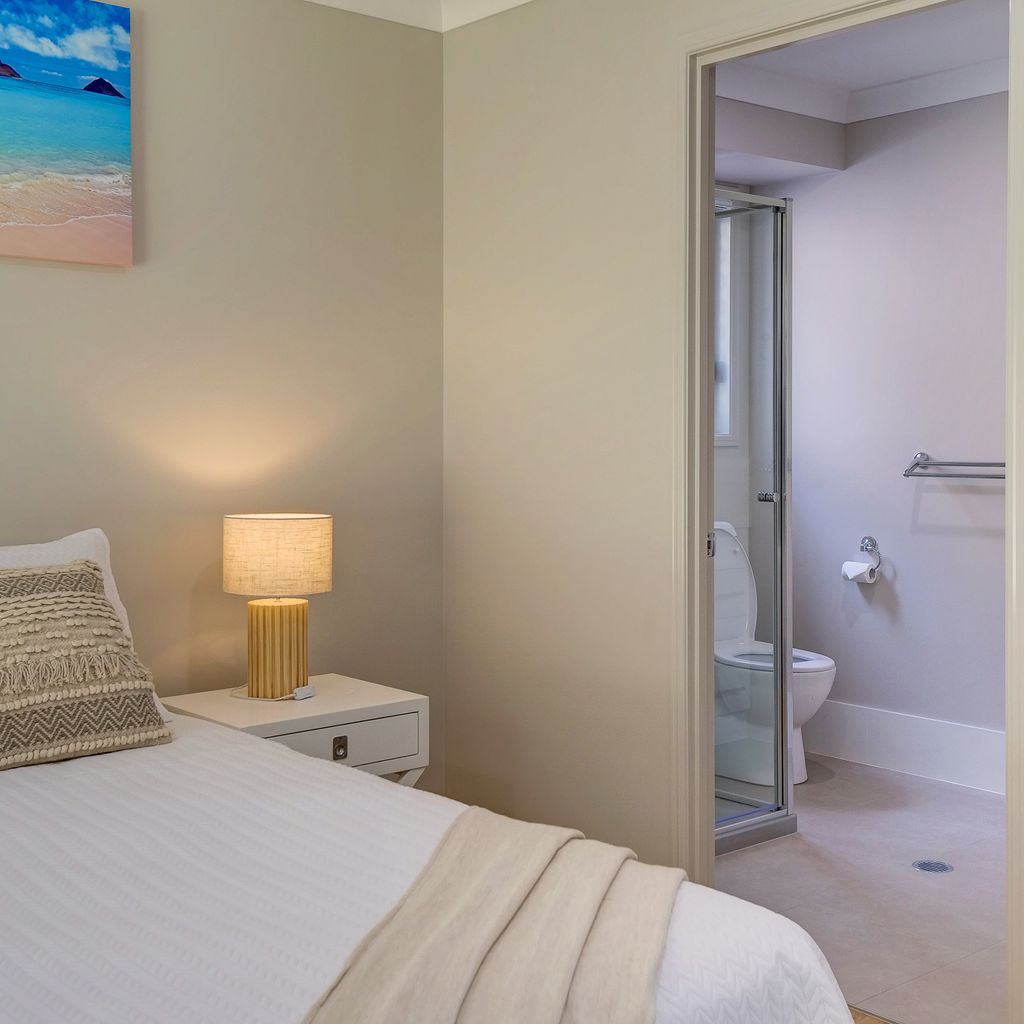 Beach Room (Bedroom 1): Features a Queen Bed with a walk-in robe, ensuite bathroom, ceiling fan, and air conditioning. Embrace the beach theme in this cozy retreat.