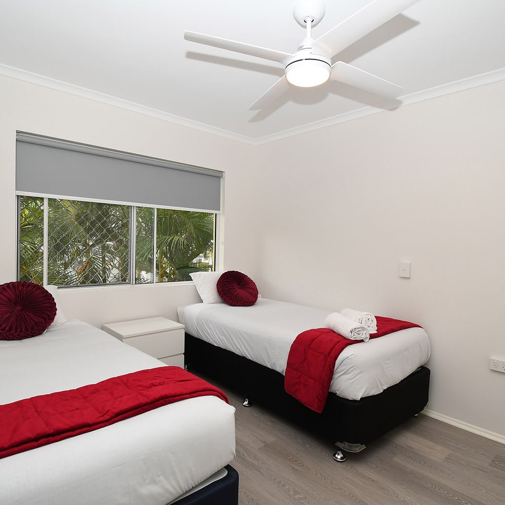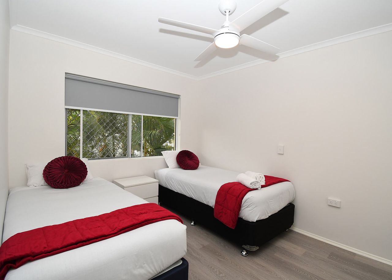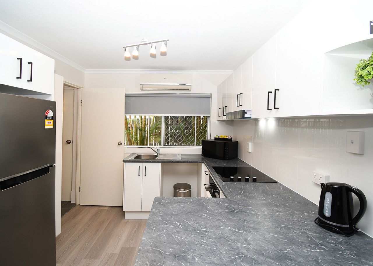 Our kitchens are equipped with a gas cooktop and oven, microwave, and refrigerator/freezer, while each laundry includes a washing machine, clothes hoist, and ironing board. Undercover parking is available for cars, with additional space for trailers and boats. Enjoy the outdoor amenities, including a gas barbecue, outdoor eating area, and a swimming pool set in tropical surrounds.