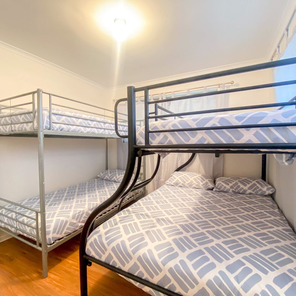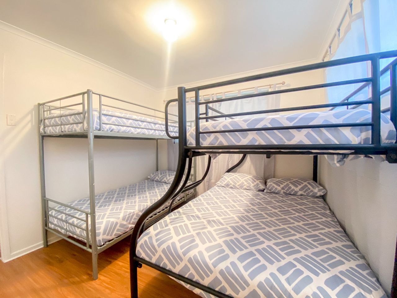 Myway offers three bedrooms accommodating up to 9 guests. Bedroom 1 features a queen bed and a flat-screen TV with a built-in DVD player, while Bedroom 2 offers a double bed and Bedroom 3 includes a single bunk bed and a tri-bunk bed. All bedrooms are equipped with ample storage space.
