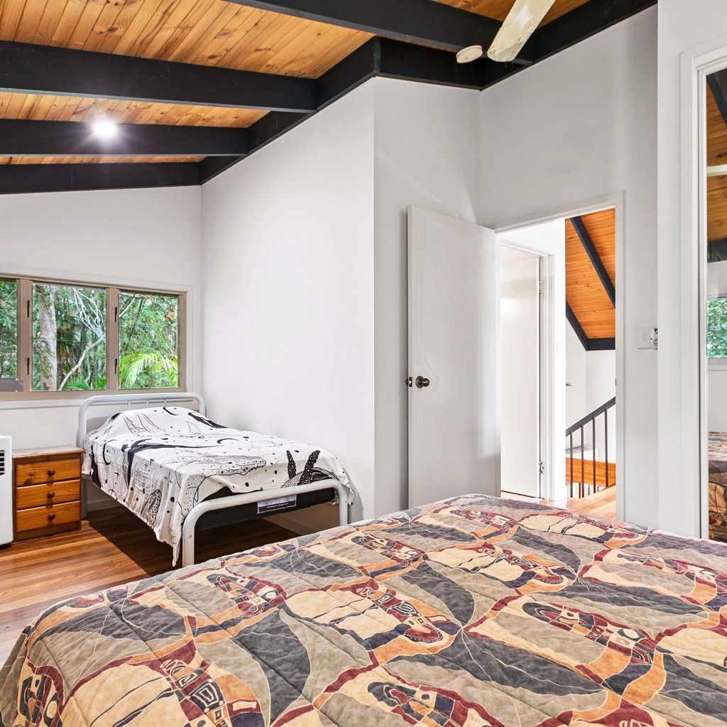 Inside, the home offers three spacious bedrooms, all air-conditioned for your comfort. The master bedroom features a luxurious queen bed and an intimate setting for a restful night’s sleep. The second bedroom is equally inviting, with a queen bed and an additional single, perfect for families or friends. The third bedroom offers two single beds, ideal for kids or additional guests. Each room offers a peaceful retreat after a long day exploring the beach, with views of the surrounding forest that make you feel miles away from the world.
