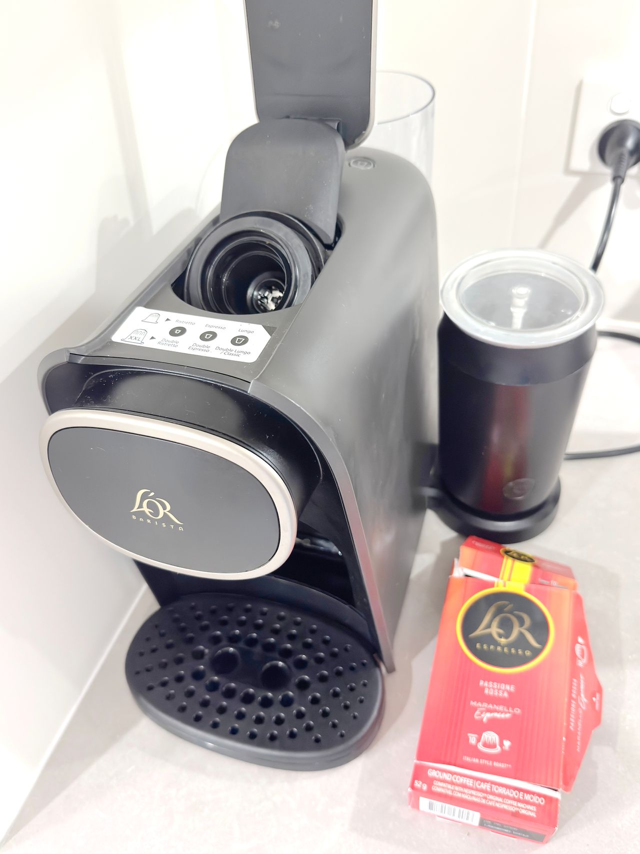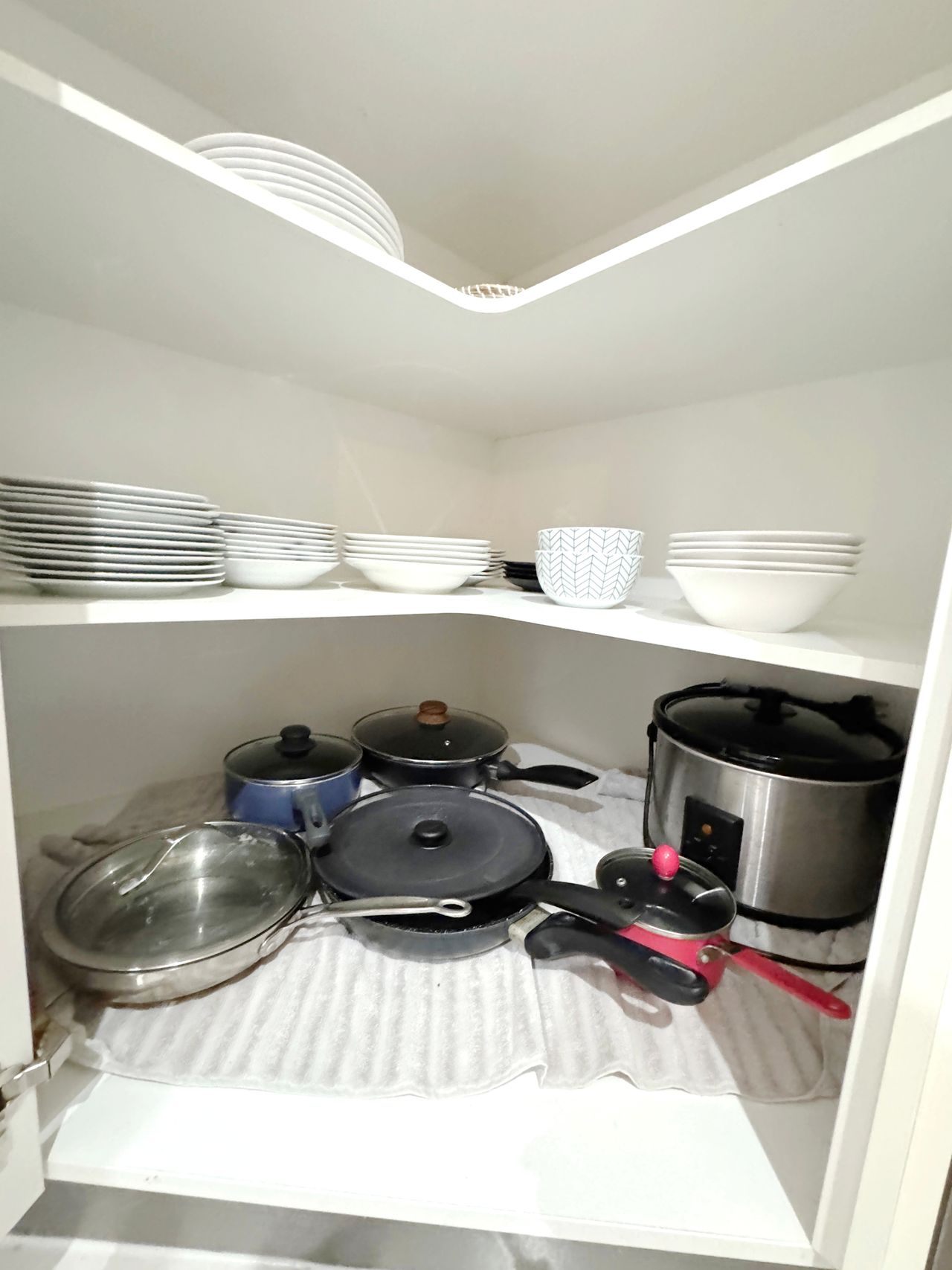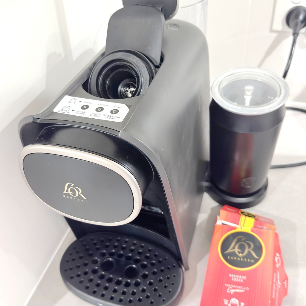 A fully equipped modern kitchen, including a fridge, freezer, gas stove, electric oven, dishwasher, coffee machine with pods, slow cooker, steamer, rice cooker, toaster, electric kettle, microwave, plus other cooking essentials like pots, pans and utensils.