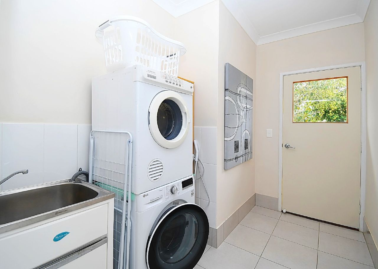Laundry with washing machine and dryer. Drying rack is available for inside and clothes line is available outside.